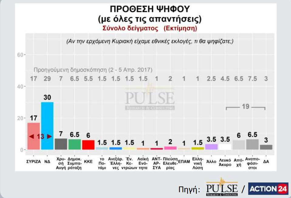 ΝΔ και ΣΥΡΙΖΑ εμφανίζουν μεγάλη διαφορά στην πρώτη μεγάλη πανελλαδική δημοσκόπηση της Pulse μετά την υπερψήφιση της συμφωνίας στη Βουλή, για λογαριασμό του Action24.