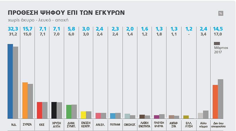 Σύμφωνα με την πρόθεση ψήφου επί των εγκύρων, ο ΣΥΡΙΖΑ βρίσκεται πίσω κατά 16,6 μονάδες και συγκεντρώνει ποσοστό 15,7%.
