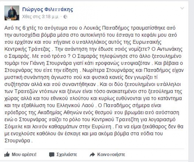 Υπενθυμίζεται ότι ο δημοσιογράφος και ειδικός γραμματέας της ΕΣΕΗΑ έγραψε, μεταξύ άλλων, στο Facebook: «Για να είμαι ξεκάθαρος δεν θα με ενοχλούσε καθόλου αν έσκαγε και μια ακόμα βόμβα στα πόδια του Στουρνάρα».