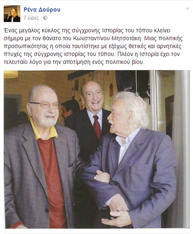 Η περιφερειάρχης Αττικής Ρένα Δούρου ανέβασε στο facebooκ μια φωτογραφία για τον θάνατο του Κωνσταντίνου Μητσοτάκη. Στην ανάρτηση είναι ο Κωνσταντίνος Μητσοτάκης με τον Μανώλη Γλέζο και τον Λεωνίδα Κύρκο.