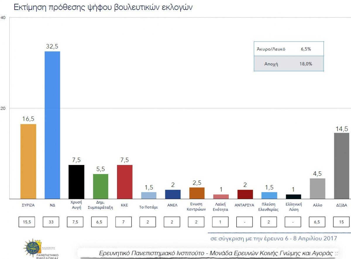 Ειδικότερα, η ΝΔ συγκεντρώνει 32,5%, ο ΣΥΡΙΖΑ 16,5%, από 7,5% η ΧΑ και το ΚΚΕ, 5,5% η ΔΗΣΥ, 2,5% η Ένωση Κεντρώων, 2% οι ΑΝΕΛ, 1,5% Το Ποτάμι και η Πλεύση Ελευθερίας, 1% η Ελληνική Λύση και η ΛΑΕ. Το 4,5% επιλέγει άλλο κόμμα, ενώ 14,5% των ερωτηθέντων δηλώνουν «δεν ξέρω/ δεν απαντώ».