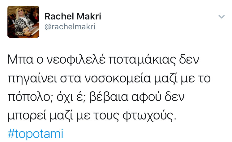 Παρά το γεγονός πως το Ποτάμι ξεκαθαρίζει με ανακοίνωσή του ότι ο επικεφαλής του Σταύρος Θεοδωράκης εισήχθη στο Metropolitan και όχι σε δημόσιο νοσοκομείο για την αφαίρεση καρκινικού όγκου, επειδή κανένα δημόσιο δεν διαθέτει το ρομποτικό μηχάνημα που απαιτείται για τη συγκεκριμένη εξειδικευμένη χειρουργική επέμβαση, η Ραχήλ Μακρή φρόντισε να ρίξει τις διαδικτυακές της ύβρεις, γράφοντας: