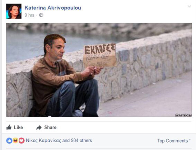 Ανακοίνωση εξέδωσε ο ΣΥΡΙΖΑ μέτα την αντίδραση της Νέας Δημοκρατίας για την ανάρτηση της δημοσιογράφου της ΕΡΤ Κατερίνας Ακριβοπούλου, η οποία ανέβασε στο facebook μια φωτογραφία (προϊόν photoshop) με τον Κυριάκο Μητσοτάκη ως επαίτη να ζητάει εκλογές.