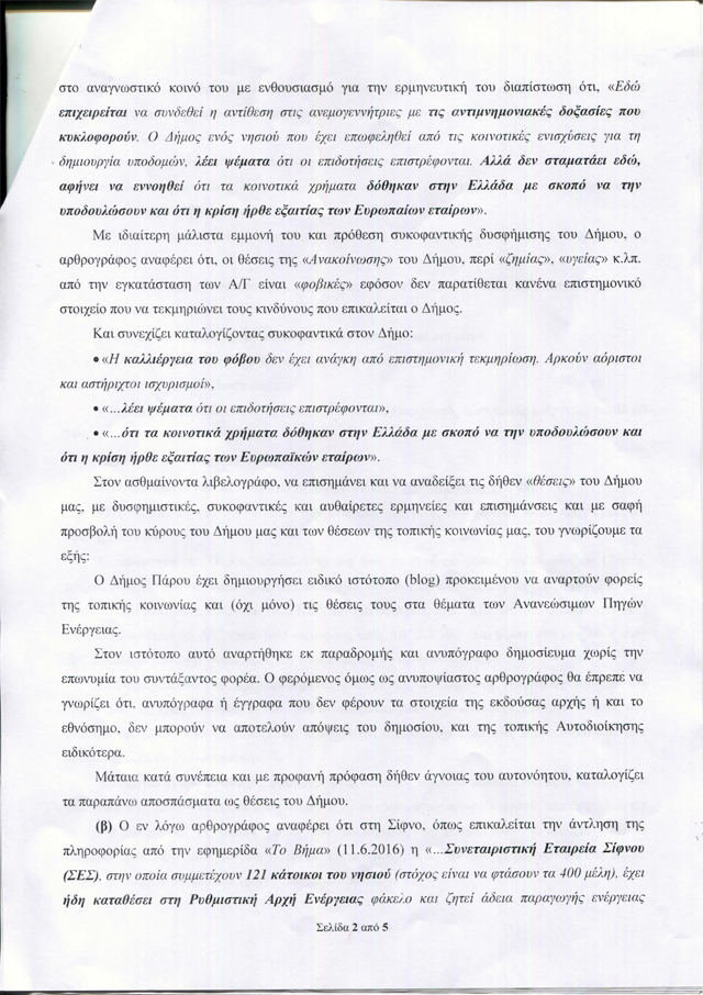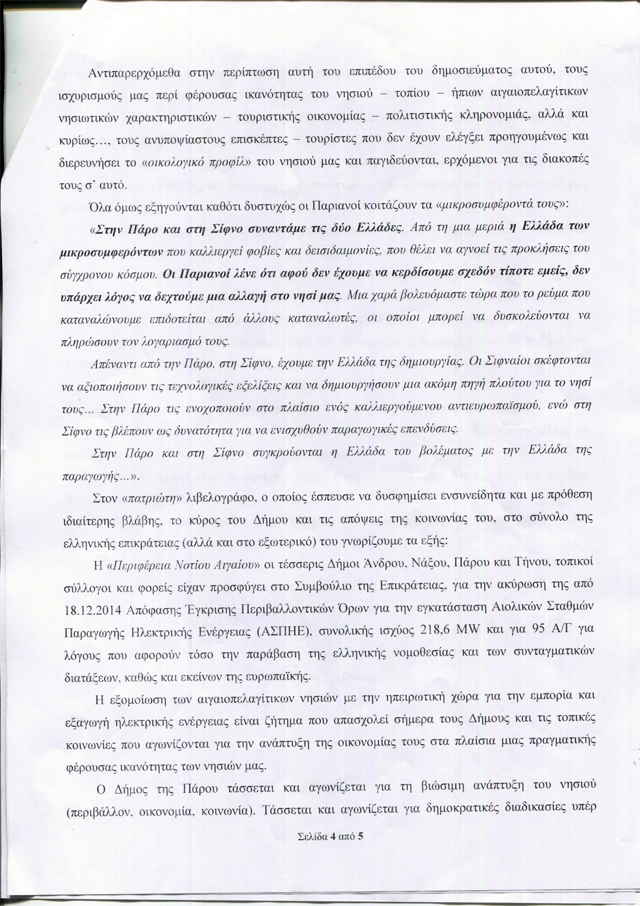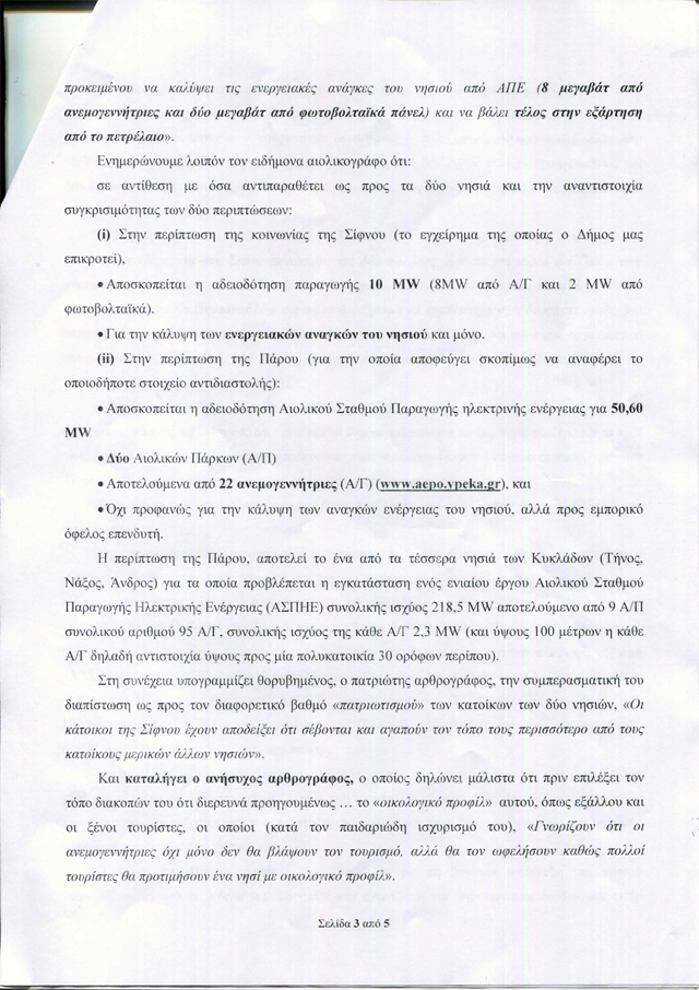 Ο αρθρογράφος της Athens Voice Σπύρος Βλέτσας έγραψε ένα άρθρο υπέρ της αιολικής ενέργειας στην Πάρο. Ο δήμαρχος του νησιού διαφωνεί με το άρθρο και θέλει να απαντήσει. Ευχαρίστως. Είναι χαρά για τα σοβαρά Μέσα Ενημέρωσης, να αναπτύσσεται διάλογος στις σελίδες τους. Γίνονται πιο ενδιαφέροντα, πιο ελκυστικά.