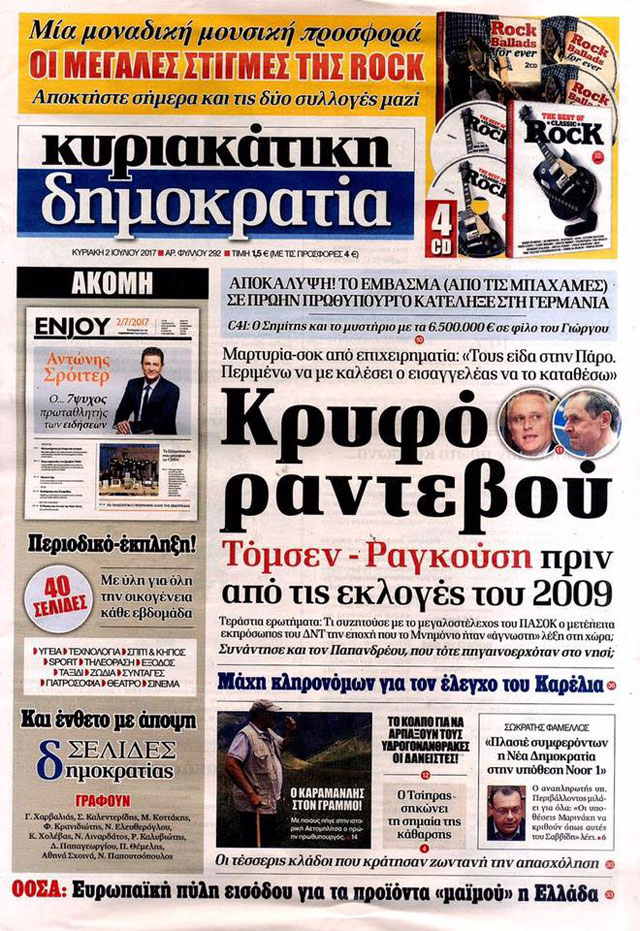 Η εφημερίδα κυριακάτικη δημοκρατία εμφάνισε στην πρώτη σελίδα της ως κεντρικό θέμα ρεπορτάζ σύμφωνα με το οποίο ο Γιάννης Ραγκούσης συναντήθηκε το 2009 πριν από τις εκλογές με τον Τόμσεν πριν εκείνος αναλάβει εκπρόσωπος του ΔΝΤ. «Μαρτυρία σοκ από επιχειρηματία που του είδε στην Πάρο» γράφει η εφημερίδα.