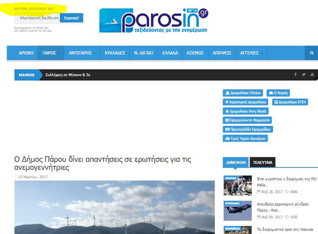 Με χαρά είδα στο εξώδικό σας ότι δεν υιοθετείτε τις απόψεις που διατυπώνονται στο κείμενο και διευκρινίζετε ότι εκ παραδρομής δημοσιεύτηκε στον ιστότοπο του Δήμου «ανυπόγραφο δημοσίευμα χωρίς την επωνυμία του συντάξαντος φορέα». Το ίδιο κείμενο, όπως σας ανέφερα και παραπάνω, εμφανίζεται στην ιστοσελίδα parosin.gr με τον τίτλο «Ο Δήμος Πάρου δίνει απαντήσεις σε ερωτήσεις για τις ανεμογεννήτριες», αλλά και στο blog Sagini3, όπου μάλιστα παρουσιάζεται με τη μορφή συνέντευξης η οποία συνοδεύεται και με φωτογραφία σας.