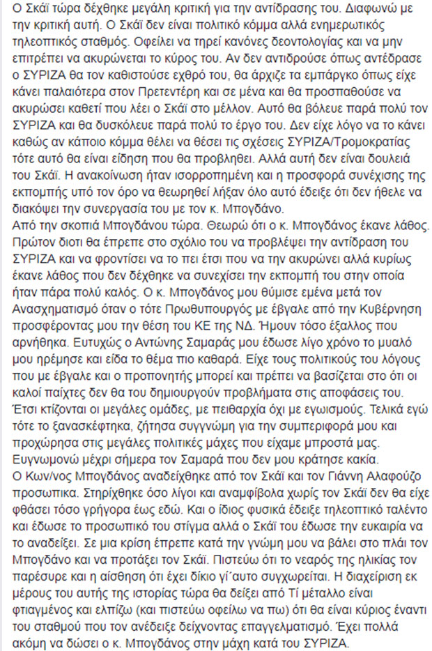 Έχει τοποθετηθεί για διάφορα θέματα που άπτονται της πολιτικής, της κοινωνίας, της εξωτερικής πολιτικής, της αγροτικής παραγωγής, της υγείας, της παιδείας, της οικονομίας, ακόμα και του lifestyle. Εδώ και ένα 24ωρο η απομάκρυνση Μπογδάνου από τον ΣΚΑΪ έχει γίνει «talk of the town». Πολύ φυσικό, λοιπόν, ο Άδωνις Γεωργιάδης να εκφράσει την άποψή του και για αυτό το ζήτημα, εμπλουτίζοντάς το με την αγαπημένη του κριτική κατά της κυβέρνησης και του ΣΥΡΙΖΑ. Ο αντιπρόεδρος της ΝΔ τόνισε με νόημα πως «έχει πολλά ακόμη να δώσει στη μάχη κατά του ΣΥΡΙΖΑ».