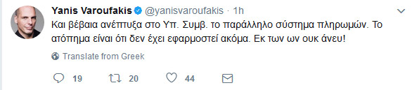 Απαντώντας ουσιαστικά στον αναπληρωτή υπουργό Αγροτικής Ανάπτυξης και Τροφίμων, Γιάννη Τσιρώνη, που δήλωσε στον τηλεοπτικό σταθμό ΣΚΑΪ ότι ο τότε ΥΠΟΙΚ είχε παρουσιάσει στο υπουργικό συμβούλιο το σύστημα παράλληλων πληρωμών, ο κ. Βαρουφάκης έγραψε στο Twitter: «Και βέβαια ανέπτυξα στο υπουργικό συμβούλιο το παράλληλο σύστημα πληρωμών. Το ατόπημα είναι ότι δεν έχει εφαρμοστεί ακόμα! Εκ των ων ουκ άνευ!».