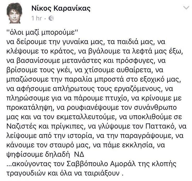 «Όλοι μαζί μπορούμε να δείρουμε την γυναίκα μας, τα παιδιά μας, να κλέψουμε το κράτος, να υποκλιθούμε σε Ναζιστές... ακούγοντας τον Σαββόπουλο Αμοραλ της κλοπής τραγουδιών» γράφει στο facebook ο φίλος και σύμβουλος στρατηγικού σχεδιασμού του πρωθυπουργού Νίκος Καρανίκας.