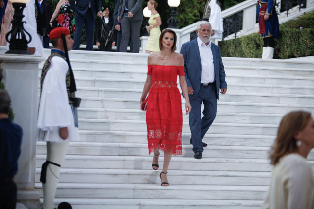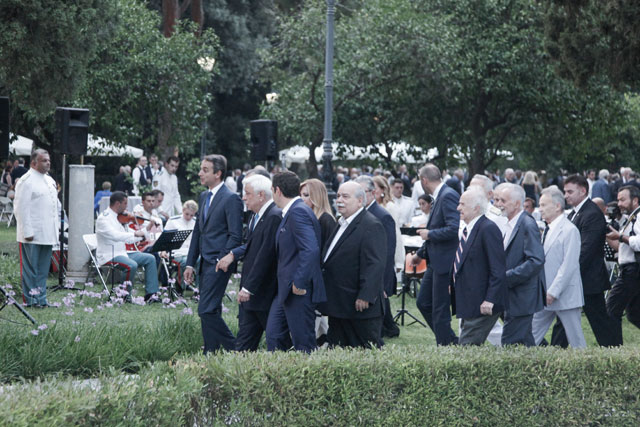 Τα φλας των φωτογράφων άστραψαν, όπως κάθε χρόνο, προκειμένου να απαθανατίσουν τις στιγμές των πολιτικών προσώπων και γενικώς των προσκεκλημένων στην ετήσια δεξίωση για την αποκατάσταση της Δημοκρατίας, στους κήπους του Προεδρικού Μεγάρου.