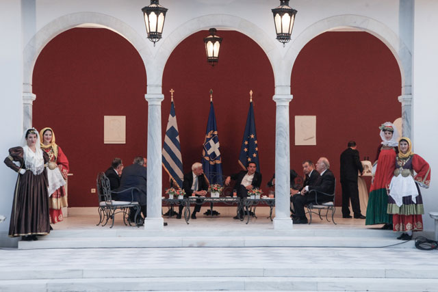 Ο πρωθυπουργός Αλέξης Τσίπρας και οι πολιτικοί αρχηγοί, με χαλαρή διάθεση και χαμόγελα κάθισαν μαζί στο κιόσκι με τον Πρόεδρο της Δημοκρατίας Προκόπη Παυλόπουλο στο κέντρο, ενώ ξεχωριστή ήταν η παρουσία των μελών του Λυκείου Ελληνίδων Καλαμάτας που στάθηκαν «παραστάτριες» στο κιόσκι, ντυμένες με τοπικές ενδυμασίες.