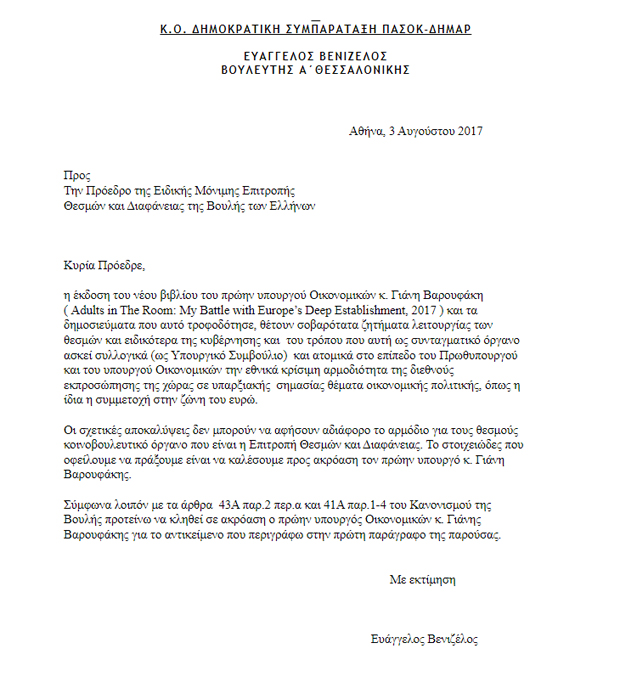 Την ακρόαση του πρώην υπουργού Oικονομικών Γιάνη Βαρουφάκη στην Επιτροπή Θεσμών και Διαφάνειας της Βουλής ζήτησε στην έναρξη της σημερινής συνεδρίασης της Επιτροπής ο Ευάγγελος Βενιζέλος που κατέθεσε σχετικό γραπτό αίτημα.