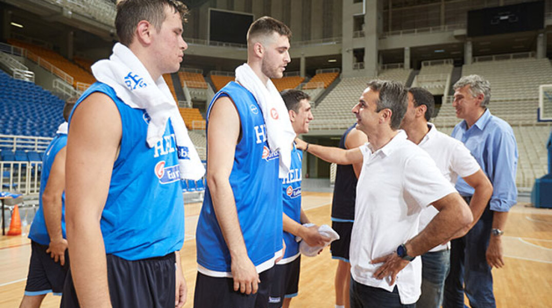 Ο αρχηγός της Νέας Δημοκρατίας παρακολούθησε μέρος της προπόνησης χαιρέτησε τους παίκτες και αστειεύτηκε μαζί τους. Προηγουμένως τον είχαν υποδεχτεί στο κλειστό του ΟΑΚΑ ο πρόεδρος της ομοσπονδίας Γιώργος Βασιλακόπουλος και ο Παναγιώτης Φασούλας.