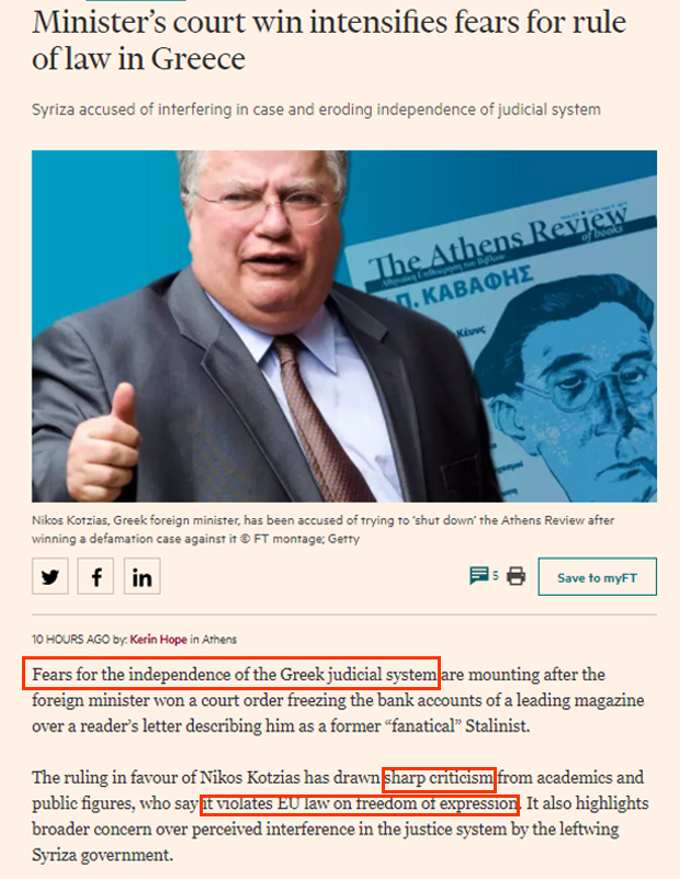 Στο επίμαχο άρθρο με τίτλο «Δικαστική νίκη υπουργού εντείνει τους φόβους για το Κράτος Δικαίου στην Ελλάδα» γίνεται αναφορά στη δικαστική διαμάχη του υπουργού Εξωτερικών Νίκου Κοτζιά με το περιοδικό Athens Review of Books και την κίνηση του υπουργού να παγώσει τους τραπεζικούς λογαριασμούς των εκδοτών της ARB, παρόλο που ο Άρειος Πάγος τον δικαίωσε και αποκατέστησε τη φήμη του, ωθώντας έτσι την επιχείρηση ένα βήμα πριν από το να κατεβάσει ρολά.