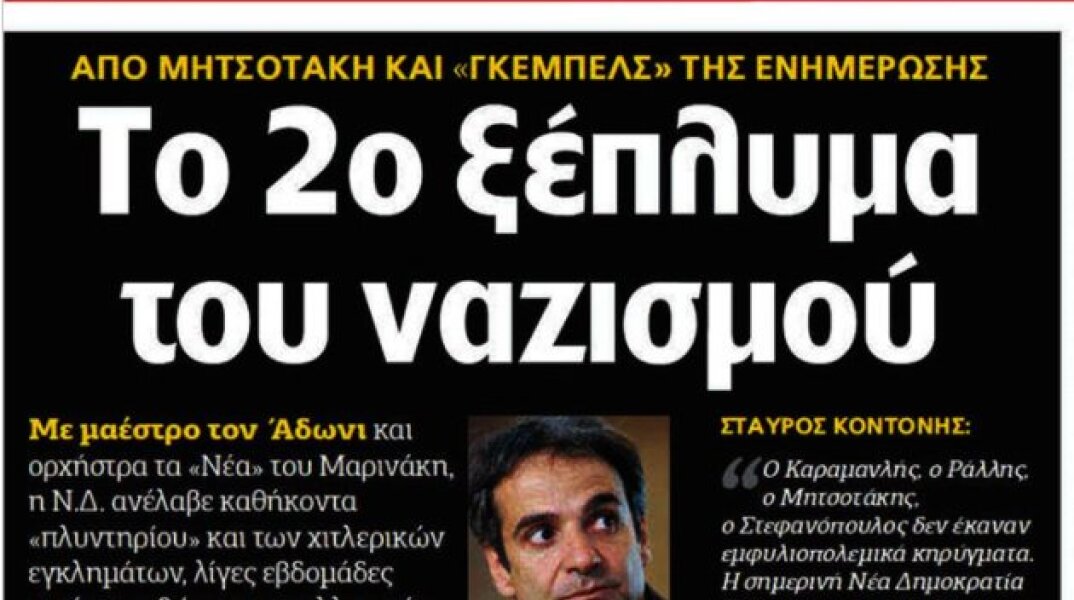 Το κεντρικό θέμα της «Αυγής» σήμερα Τρίτη με τίτλο «Το 2ο ξέπλυμα του ναζισμού» λέει ότι η Νέα Δημοκρατία του κ. Κυριάκου Μητσοτάκη «ξεπλένει» ελληνική Ακροδεξιά και ναζισμό με χρήση μεθόδων τύπου Γκέμπελς (Σ.Σ. Ήταν ο υπουργός Προπαγάνδας της ναζιστικής Γερμανίας στα χρόνια 1933 - 1945), κάτι που δεν έκαναν προηγούμενοι, μεταπολιτευτικοί ηγέτες του ίδιου κόμματος. Ταυτόχρονα, λοιδορεί τον κ. Γεωργιάδη, ενώ εγκαλεί και προς την ίδια κατεύθυνση και τους κ. Βενιζέλο, Λοβέρδο της ΔΣ/ ΠΑΣΟΚ.