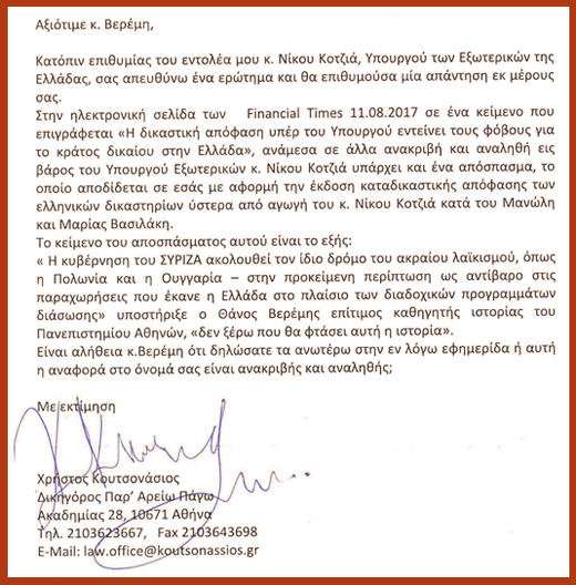 Στην ηλεκτρονική σελίδα των Financial Times 11.08.2017 σε ένα κείμενο που επιγράφεται «Η δικαστική απόφαση υπέρ του Υπουργού εντείνει τους φόβους για το κράτος δικαίου στην Ελλάδα», ανάμεσα σε άλλα ανακριβή και αναληθή εις βάρος του Υπουργού Εξωτερικών κ. Νίκου Κοτζιά υπάρχει και ένα απόσπασμα, το οποίο αποδίδεται σε εσάς με αφορμή την έκδοση καταδικαστικής απόφασης των ελληνικών δικαστηρίων ύστερα από αγωγή του κ. Νίκου Κοτζιά κατά του Μανώλη και Μαρίας Βασιλάκη.