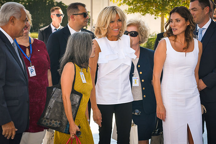 Στο Ίδρυμα Σταύρος Νιάρχος, την Πρώτη Κυρία της Γαλλίας υποδέχτηκε η Μπέτυ Μπαζιάνα. Η σύντροφος του Έλληνα πρωθυπουργού επέλεξε για την περίσταση ένα αμάνικο μίντι λευκό φόρεμα το οποίο συνδύασε με μπεζ πέδιλα.