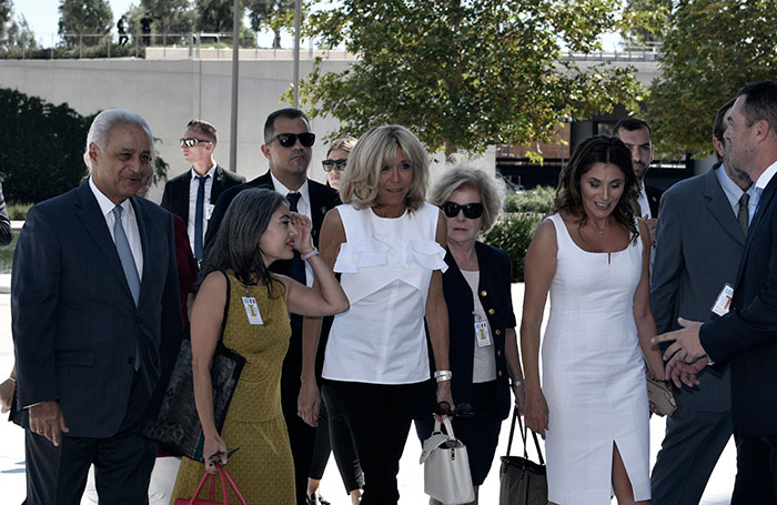 Στο Ίδρυμα Σταύρος Νιάρχος, την Πρώτη Κυρία της Γαλλίας υποδέχτηκε η Μπέτυ Μπαζιάνα. Η σύντροφος του Έλληνα πρωθυπουργού επέλεξε για την περίσταση ένα αμάνικο μίντι λευκό φόρεμα το οποίο συνδύασε με μπεζ πέδιλα.