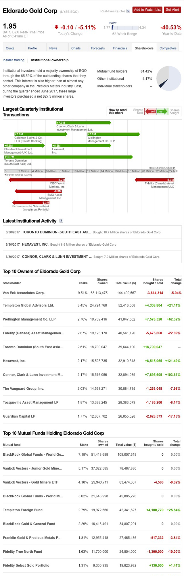 Όμως αυτοί που στέλνουν τους Καναδούς στα τσακίδια, δεν διώχνουν μόνο μια εταιρεία εξώρυξης που ήρθε, έπαιξε και έχασε. Μέτοχοι και ιδιοκτήτες της Eldorado Gold όπως φαίνεται από το παρακάτω γράφημα του CNN είναι τα μεγαλύτερα επεδυτικά κεφάλαια και funds στον κόσμο, αυτά που ο πρωθυπουργός δηλώνει με κάθε ευκαιρία ότι καλωσορίζει μαζί με την ανάπτυξη που μόνο αυτός βλέπει.