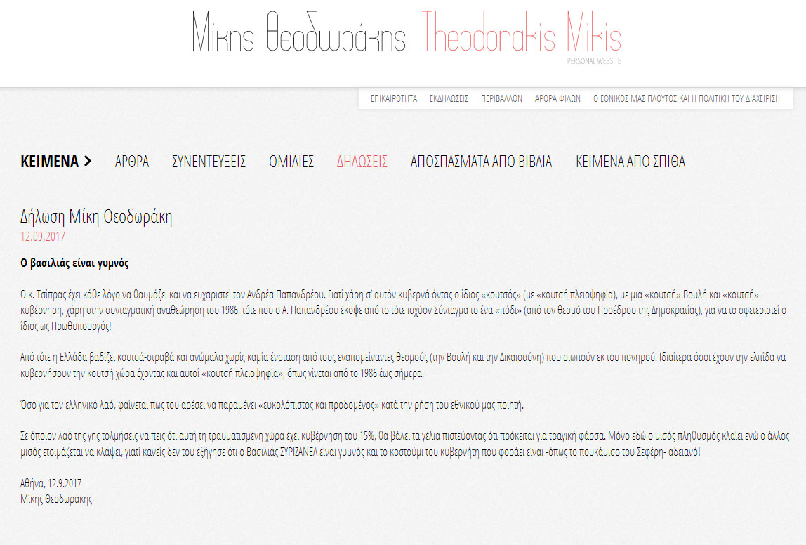 Σε δήλωσή του με τον τίτλο «Ο βασιλιάς είναι γυμνός» που δημοσιεύτηκε στο προσωπικό του ιστολόγιο ο Μίκης Θεοδωράκης δίνει τη δική του απάντηση στον σάλο που δημιουργήθηκε την προηγούμενη εβδομάδα με την παρομοίωση του Αλέξη Τσίπρα από τον ίδιο του τον εαυτό με τον Ανδρέα Παπανδρέου.
