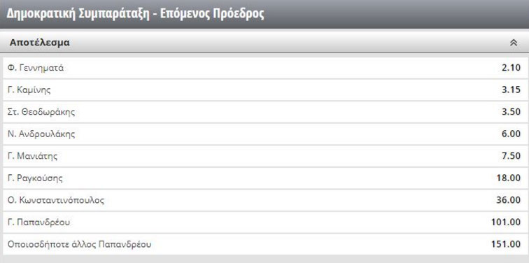 Στην παρακάτω εικόνα εμφανίζονται ενδεικτικά οι αποδόσεις της εταιρείας «Novibet», σύμφωνα με τις οποίες «φαβορί» στην κούρσα εμφανίζεται να είναι η Φώφη Γεννηματά.