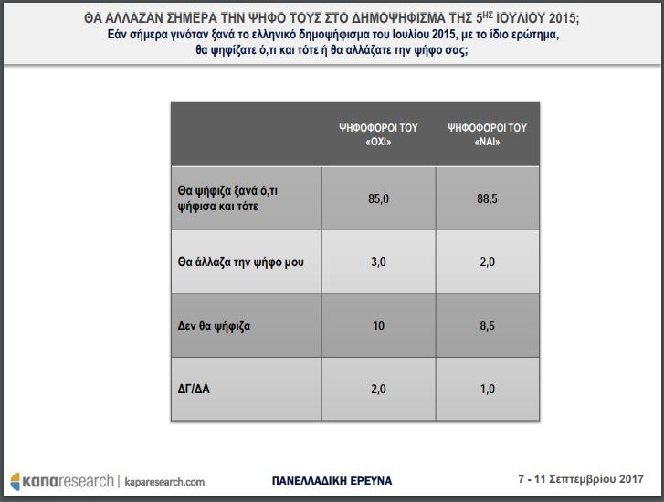 Σε πρόσφατη δημοσκόπηση της εταιρίας Kapa research τέθηκε η ερώτηση «Εάν σήμερα γινόταν ξανά το ελληνικό δημοψήφισμα του Ιουλίου 2015, με το ίδιο ερώτημα, θα ψηφίζατε ό,τι και τότε ή θα αλλάζατε την ψήφο σας;» Από όσους ψήφισαν ΟΧΙ το 85% δηλώνει ότι θα ψήφιζε ξανά το ίδιο, ενώ ένα 10% δηλώνει ότι δεν θα ψήφιζε.