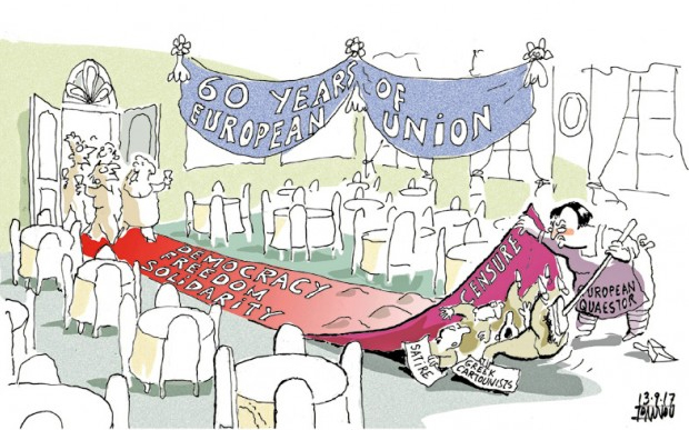 Μαζί με τον ευρωβουλευτή Patrick Le Hyaric, oργανώνουμε την έκθεση γελοιογραφίας «EU turns 60: A Cartoon Party», με αφορμή τα 60 χρόνια από την υπογραφή της συνθήκης της Ρώμης. Όπως οφείλαμε, υποβάλαμε στην κα Catherine Bearder, την αρμόδια κοσμήτορα, όλο το περιεχόμενο της έκθεσης που ήταν γελοιογραφίες πολιτικού χιούμορ. Προς μεγάλη μας έκπληξη η κοσμήτορας λογόκρινε σχεδόν τις μισές.