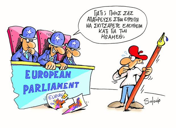 Ο ευρωβουλευτής εξέφρασε την έντονη δυσαρέσκειά του για την απόφαση της κοσμήτορος Catherine Bearder να λογοκρίνει ελληνικές γελοιογραφίες που θα παρουσιαστούν την επόμενη εβδομάδα στο Ευρωκοινοβούλιο στο πλαίσιο της έκθεσης «EU turns 60: A Cartoon Party». Όλα καλά μέχρι εδώ.