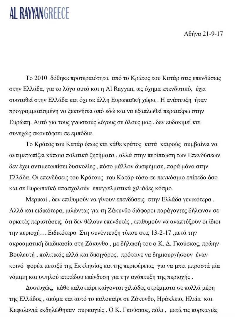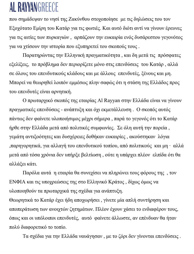 Η ειρωνική ανακοίνωση για τα εμπόδια που θέτει η κυβέρνηση στους ξένους επενδυτές με αφορμή την απόφαση της Al Rayyah να αποχωρήσει από την Ελλάδα