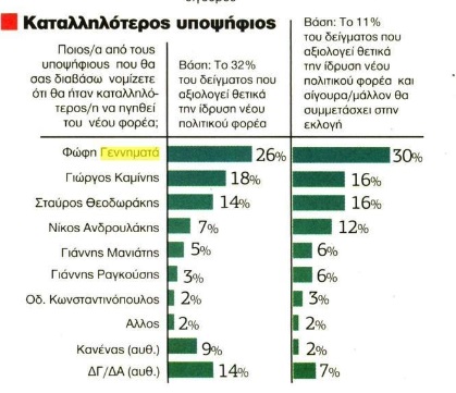 Σε αυτούς που αξιολογούν θετικά την ίδρυση του νέου φορέας η κ. Γεννηματά προηγείται με 26% και ακολοθούν με 18% ο κ. Καμίνης και ο κ. Θεοδωράκης με 14%. Ο κ. Ανδρουλάκης βρίσκεται στο 7%.