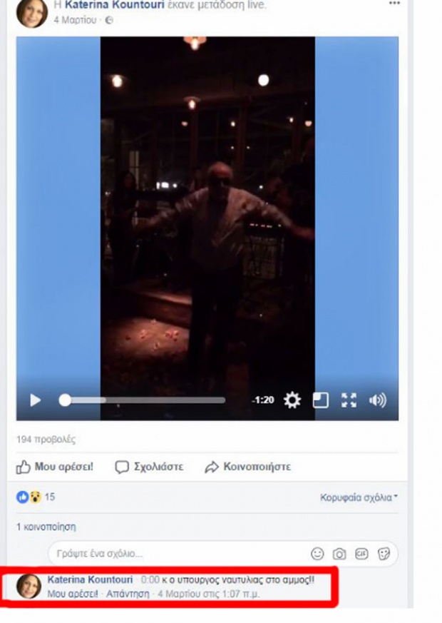 Η σύζυγος του Θόδωρου Κουντούρη, Κατερίνα, είναι εκείνη που ανάρτησε το σχετικό βίντεο στο προσωπικό της λογαριασμό στο facebook, περήφανη για το γεγονός ότι ο υπουργός τίμησε με την παρουσία του τον σύντροφο της ζωής της
