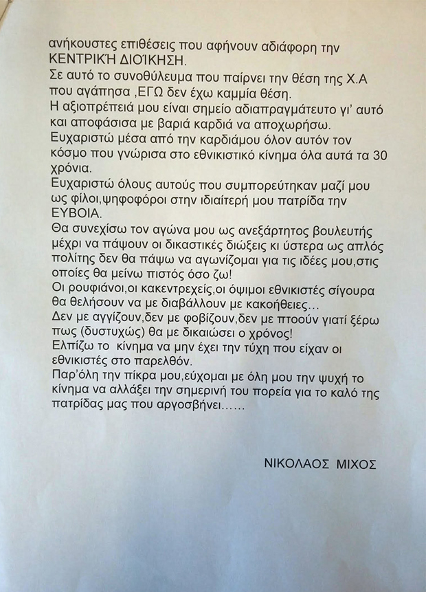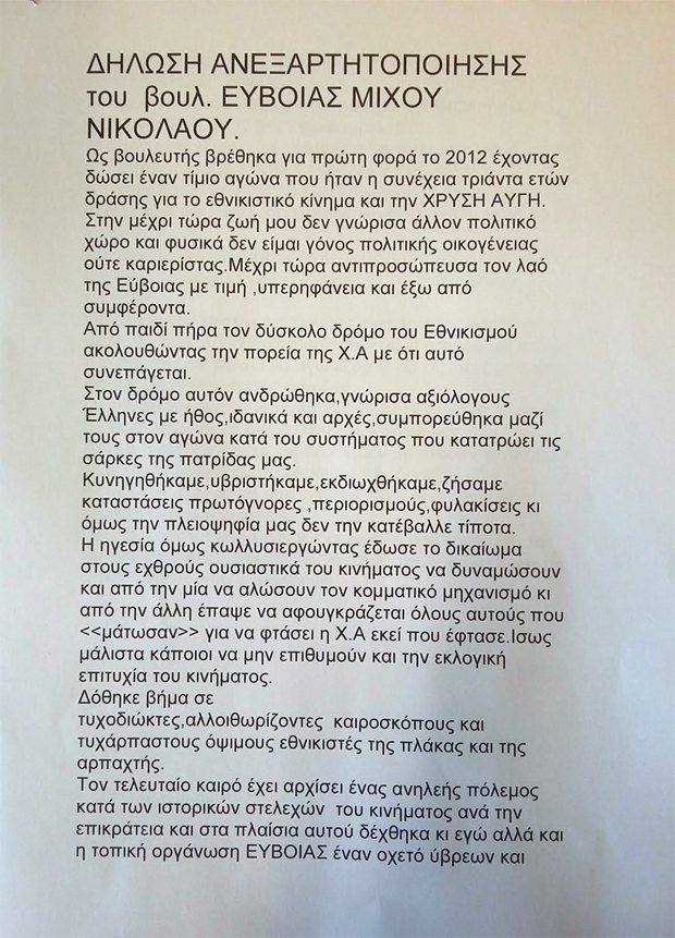 Την απόφασή του να ανεξαρτητοποιηθεί από τη Χρυσή Αυγή, με την οποία είχε εκλεγεί βουλευτής Ευβοίας γνωστοποίησε το πρωί της Τρίτης με επιστολή του ο Νίκος Μίχος.