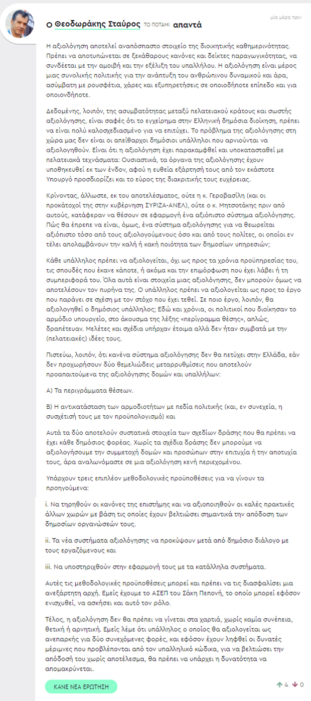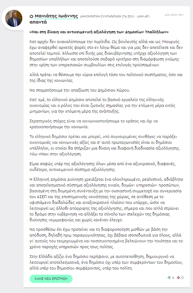 Η ερώτηση που έκανε ο Λευτέρης Αντωνόπουλος ήταν: «Ποια είναι η θέση σας για την αξιολόγηση των δημοσίων υπαλλήλων; Έχετε να προτείνετε κάτι διαφορετικό από το τωρινό πλαίσιο;».