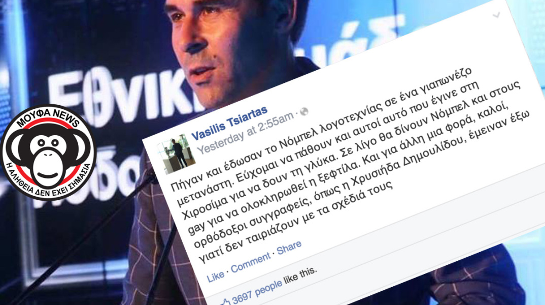 Συγκεκριμένα, ο Βασίλης Τσιάρτας αναφέρει: «Πήγαν και έδωσαν το Νόμπελ λογοτεχνίας σε ένα γιαπωνέζο μετανάστη. Εύχομαι να πάθουν και αυτοί αυτό που έγινε στη Χιροσίμα για να δουν τη γλύκα. Σε λίγο θα δίνουν Νόμπελ και στους gay για να ολοκληρωθεί η ξεφτίλα. Και για άλλη μια φορά, καλοί, ορθόδοξοι συγγραφείς, όπως η Χρυσιήδα Δημουλίδου, έμειναν έξω γιατί δεν ταιριάζουν με τα σχέδιά τους».