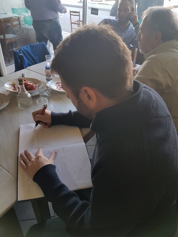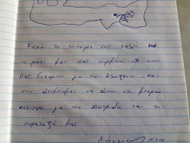 Ο Ν. Ανδρουλάκης, αν και στην Καστοριά, θυμήθηκε την πατρίδα του, την Κρήτη, σχεδίασε τον χάρτη του νησιού κι έγραψε: «Καλό το τσίπουρο σας, καλή και η ρακή μας, σας περιμένω στο νησί μας. Ευχαριστώ για τη φιλοξενία και σας δεσμεύομαι να κάνω ό,τι μπορώ καλύτερο για την πατρίδα και την παράταξή μας».