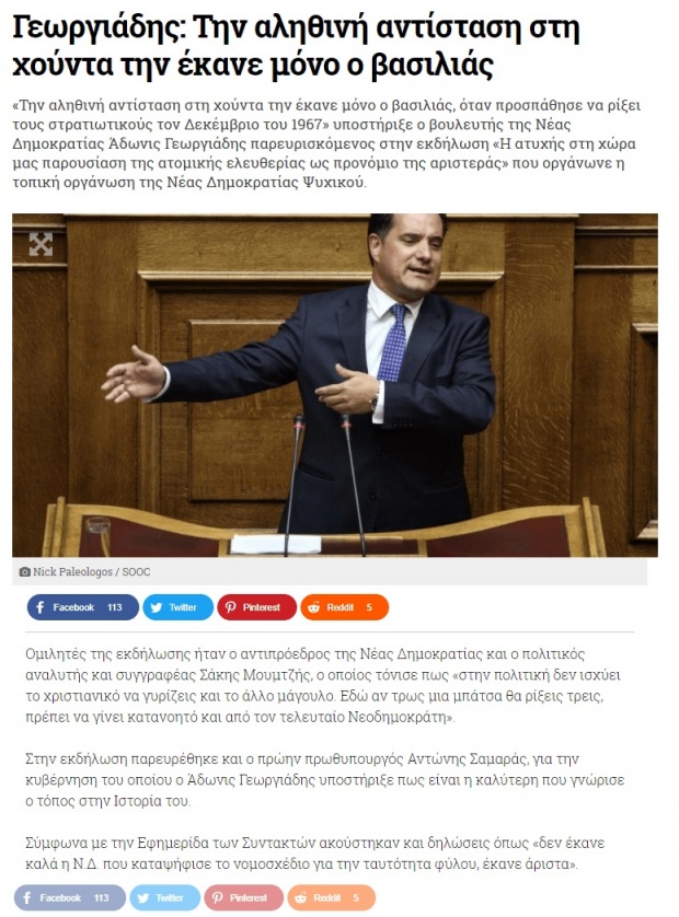Σάλο έχει προκαλέσει τις τελευταίες ώρες δήλωση που φέρεται να έχει κάνει ο αντιπρόεδρος της ΝΔ Άδωνις Γεωργιάδης πως «την αληθινή αντίσταση στη χούντα την έκανε μόνο ο βασιλιάς». Είναι αλήθεια;
