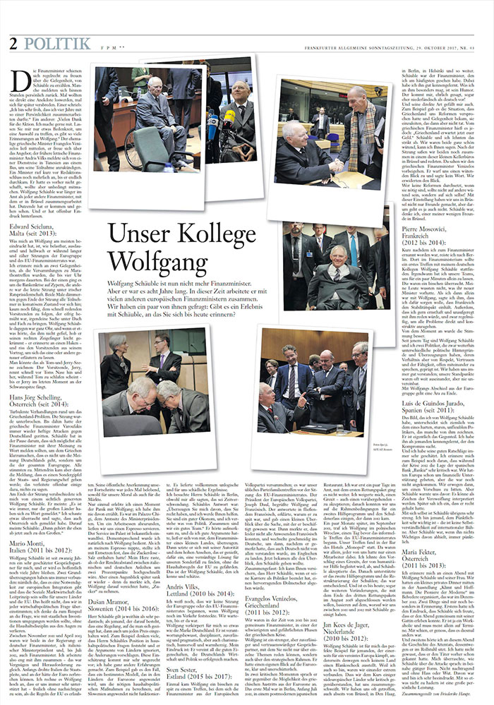 O Ευάγγελος Βενιζέλος συμμετείχε σε αφιέρωμα της εφημερίδας Frankfurter Allgemeine Sonntagszeitung στο οποίο διατελέσαντες υπουργοί οικονομικών από διάφορες χώρες αναφέρθηκαν στην εμπειρία της συνεργασίας τους με τον Βόλφγκανγκ Σόιμπλε.