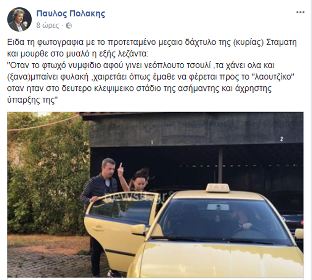 Συγκεκριμένα έγραψε: «Είδα τη φωτογραφία με το προτεταμένο μεσαίο δάχτυλο της (κυρίας) Σταμάτη και μου ‘ρθε στο μυαλό η εξής λεζάντα: "Όταν το φτωχό νυμφίδιο αφού γίνει νεόπλουτο τσουλί ,τα χάνει όλα και (ξανά)μπαίνει φυλακή ,χαιρετάει όπως έμαθε να φέρεται προς το "λαουτζίκο" όταν όταν στο δεύτερό κλεψιμαίικο στάδιο της ασήμαντης και άχρηστης ύπαρξης της"».