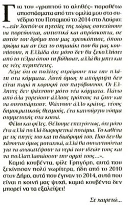 Φίλε Γρηγόρη. Συνυπογράφω το άρθρο σου. Έχω ένα-δυο σημεία που αφορούν τη στήριξη του Ποταμιού στον Δήμο της Αθήνας, αλλά δεν είναι κύρια, μπορεί να είναι και παρεξηγήσεις.