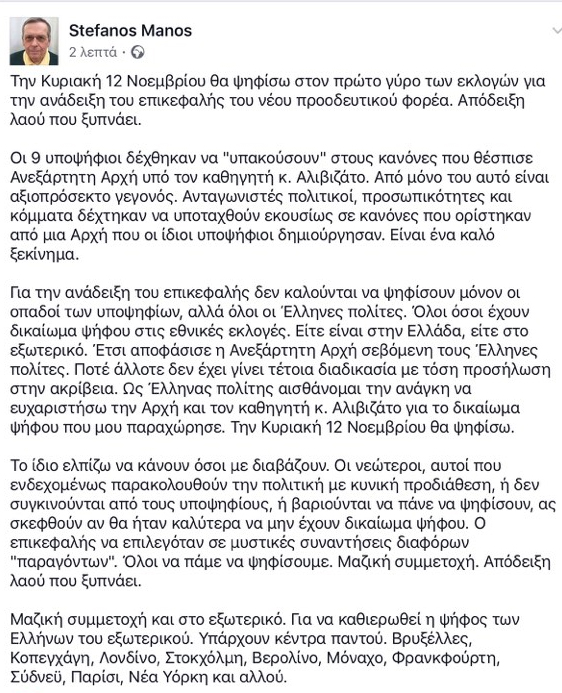O Στέφανος Μάνος, με ανάρτησή του στο Facebook, γνωστοποιεί την απόφασή του να συμμετάσχει στις εκλογές για τον πρόεδρο του νέου φορέα της Κεντροαριστεράς.