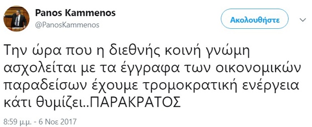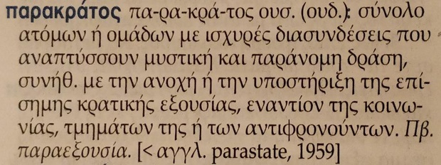 Για την αναφορά σε «παρακράτος» του Καμμένου Υπουργού της Άμυνας, την οποία υιοθέτησε και ο Δημήτρης «δυο χρόνια στο Αιγάλεω» Τζανακόπουλος, δεν θα πω πολλά. Μπορεί ο άνθρωπος (συγνώμη ανθρωπότητα) να την έκανε χωρίς να ξέρει τι ακριβώς είναι το παρακράτος και πώς δημιουργείται. Θα περιοριστώ να παρακαλέσω κάποιον που να έχει το κουράγιο να του μιλήσει, να τον ενημέρωσει πως το παρακράτος λέγεται έτσι γιατί η δράση του γίνεται με την ανοχή ή και την υποστήριξη της επίσημης κρατικής εξουσίας. Και για να μη βασιστεί αυτός ο κάποιος στα δικά μου λεγόμενα, παραθέτω το αντίστοιχο λήμμα του Χρηστικού Λεξικού της Νεοελληνικής Γλώσσας της Ακαδημίας Αθηνών.