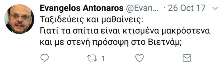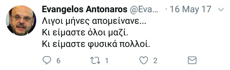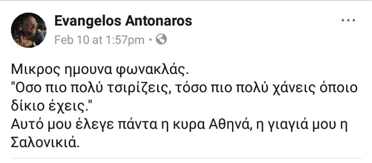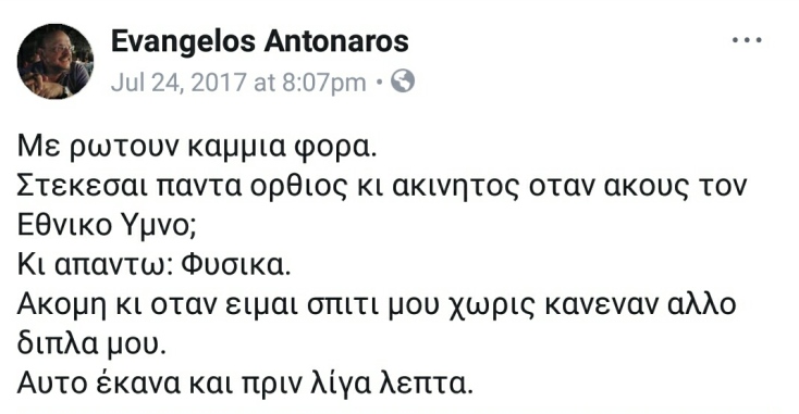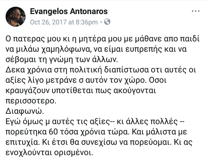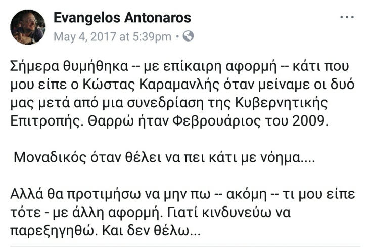 Με αφορμή τη διαγραφή του πιο σημαντικού κύκλου του Κωνσταντίνου του Εργατικού, εξαιτίας κάποιων φλογερών αναρτήσεων στα μέσα της κοινωνικής της δικτύωσης, έκανα ένα μικρό περίπατο στους λογαριασμούς του Ευάγγελου του Αντώναρου. Και δεν σας κρύβω ότι γοητεύτηκα από την προσωπικότητα του οσιομάρτυρα του Νεοκαραμανλισμού. Και είμαι σίγουρος πως, αν οι αντιαδωνικές αναρτήσεις ήταν ένας καλός λόγος να τεθεί εκτός Νέας Δημοκρατίας, αυτές εδώ είναι ένας καλός λόγος να μείνει για πάντα.