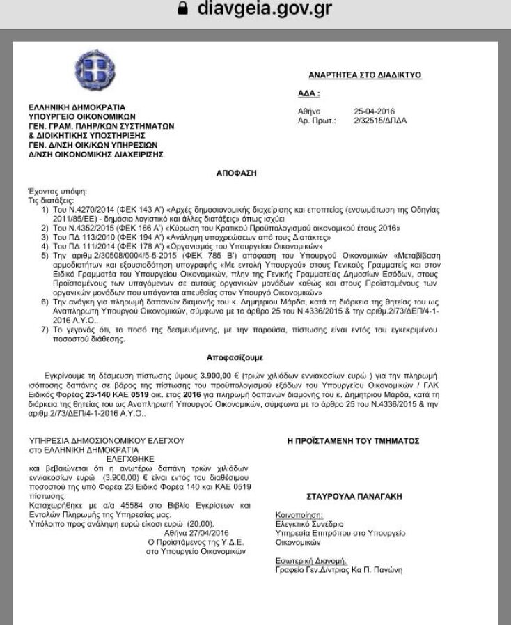 Όσον αφορά τον κ. Μάρδα, τα έγγραφα καταδεικνύουν ότι είχαν δεσμευθεί για λογαριασμό του 3.900 ευρώ, για την περίοδο που υπηρέτησε ως αναπληρωτής ΥΠΟΙΚ. Στη συνέχεια μεταφέρθηκε στο υπουργείο Εξωτερικών.