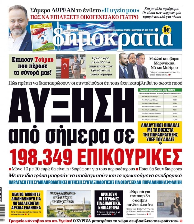 Εντυπωσιακές είναι τελευταία οι προσπάθειες του φιλοκυβερνητικού τύπου να παρουσιάσει μία άλλη πραγματικότητα από αυτήν που βιώνουν μισθωτοί και συνταξιούχοι. Ας πάρουμε για παράδειγμα το σημερινό πρωτοσέλιδο: «ΑΥΞΗΣΗ ΑΠΟ ΣΗΜΕΡΑ ΣΕ 198.349 ΕΠΙΚΟΥΡΙΚΕΣ». Η πραγματικότητα βέβαια είναι εντελώς διαφορετική.