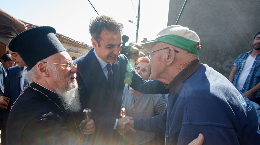 Αμέσως μετά ο πρόεδρος της Ν.Δ. είχε την ευκαιρία να περπατήσει μαζί με τον Οικουμενικό Πατριάρχη κ. Βαρθολομαίο στους πλακόστρωτους δρόμους του χωριού. Ο κ. Βαρθολομαίος ξενάγησε τον κ. Μητσοτάκη το σπίτι στο οποίο γεννήθηκε και μεγάλωσε, όπως και σε ένα μικρό μουσείο που έχουν αφιερώσει οι κάτοικοι του χωριού στη ζωή και το έργο του. Ο κ. Μητσοτάκης εξήρε το έργο του Οικουμενικού Πατριαρχείου, χάρη στις προσπάθειες του οποίου οι Έλληνες της Ίμβρου επιστρέφουν τα τελευταία χρόνια στο νησί τους. Είναι ενδεικτικό ότι από 168 εναπομείναντες Έλληνες το 2000, σήμερα στο νησί κατοικούν μόνιμα περισσότεροι από 550 Έλληνες, ανάμεσα στους οποίους και 39 μαθητές, όπως και 13 βρέφη που γεννήθηκαν στην Ίμβρο.