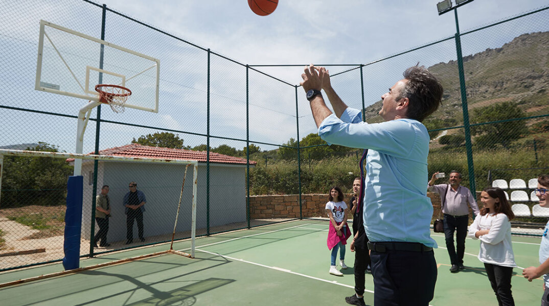 Ο κ. Μητσοτάκης συναντήθηκε με τους μαθητές, και είχε την ευκαιρία να ρίξει και μερικές βολές στο γήπεδο μπάσκετ του σχολείου.