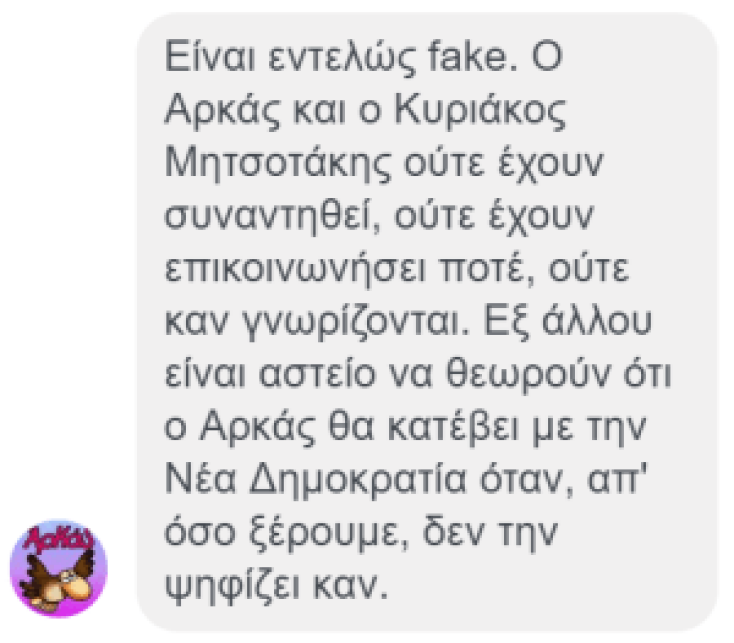 «Είναι εντελώς fake. Ο Αρκάς και ο Κυριάκος Μητσοτάκης ούτε έχουν συναντηθεί, ούτε έχουν επικοινωνήσει ποτέ, ούτε καν γνωρίζονται. Εξ άλλου είναι αστείο να θεωρούν ότι ο Αρκάς θα κατέβει με την Νέα Δημοκρατία όταν, απ’ όσο ξέρουμε, δεν την ψηφίζει καν».