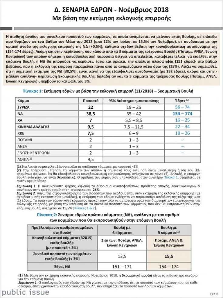 Ειδικότερα, η ΝΔ συγκεντρώνει ποσοστό 38,5%, έναντι 22% του ΣΥΡΙΖΑ. Το ΚΙΝΑΛ ΜΕ 9,5 έρχεται τρίτο, ενώ εμφανίζεται συσπειρωμένο, ενδεχομένως λόγω της απόπειρας διεμβολισμού του από το κυβερνών κόμμα. Ακολουθεί το ΚΚΕ με 7,5% και η Χρυσή Αυγή με 7%.