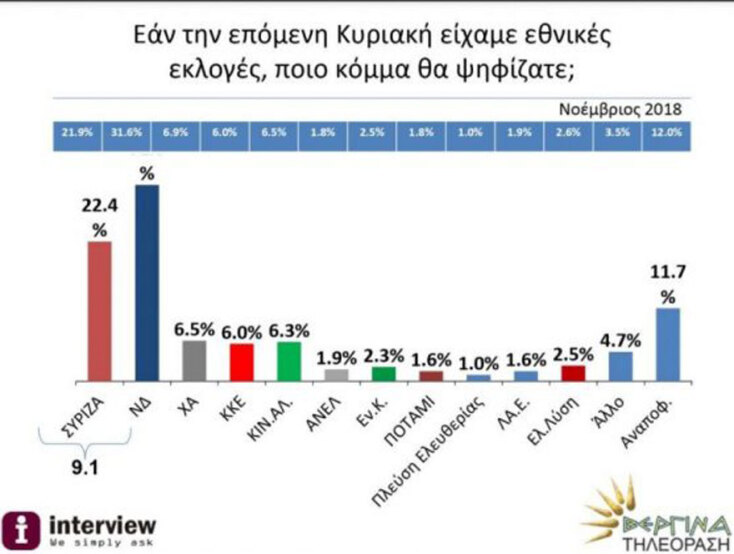 Ισχυρό προβάδισμα έναντι του ΣΥΡΙΖΑ διατηρεί η ΝΔ, με τη διαφορά να φτάνει τις 9,1 ποσοστιαίες μονάδες, σύμφωνα με τη νέα πανελλαδική δημοσκόπηση της Interview για τη ΒΕΡΓΙΝΑ TV.