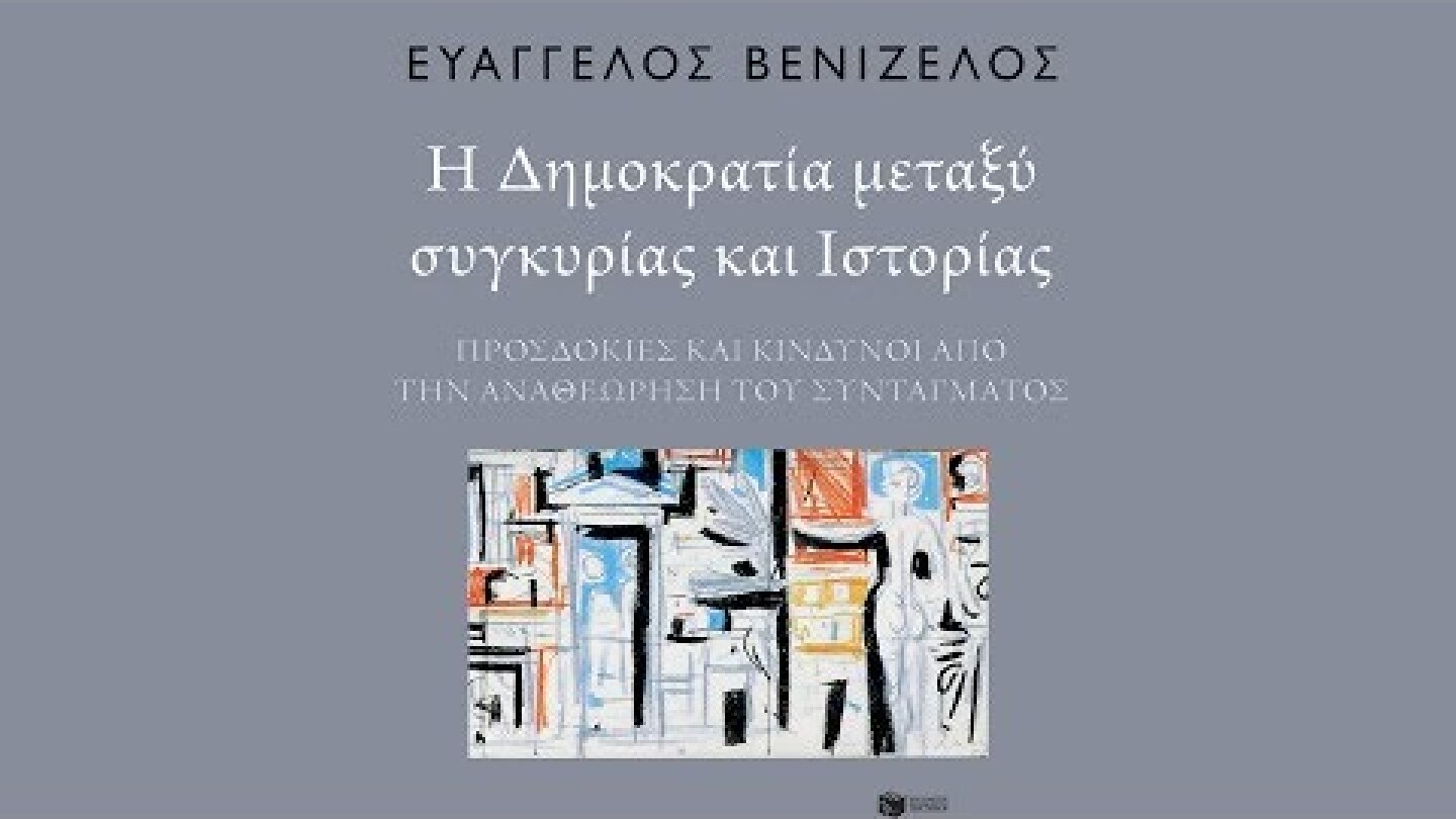 Το νέο βιβλίο του Ευάγγελου Βενιζέλου «Η Δημοκρατία μεταξύ Συγκυρίας και Ιστορίας: Προσδοκίες και κίνδυνοι από την αναθεώρηση του Συντάγματος» που κυκλοφορεί από τις εκδόσεις Πατάκη, παρουσιάζεται το απόγευμα της Πέμπτης 20 Δεκεμβρίου στο Auditorium του Γαλλικού Ινστιτούτου (Σίνα 31) στις 18.15.